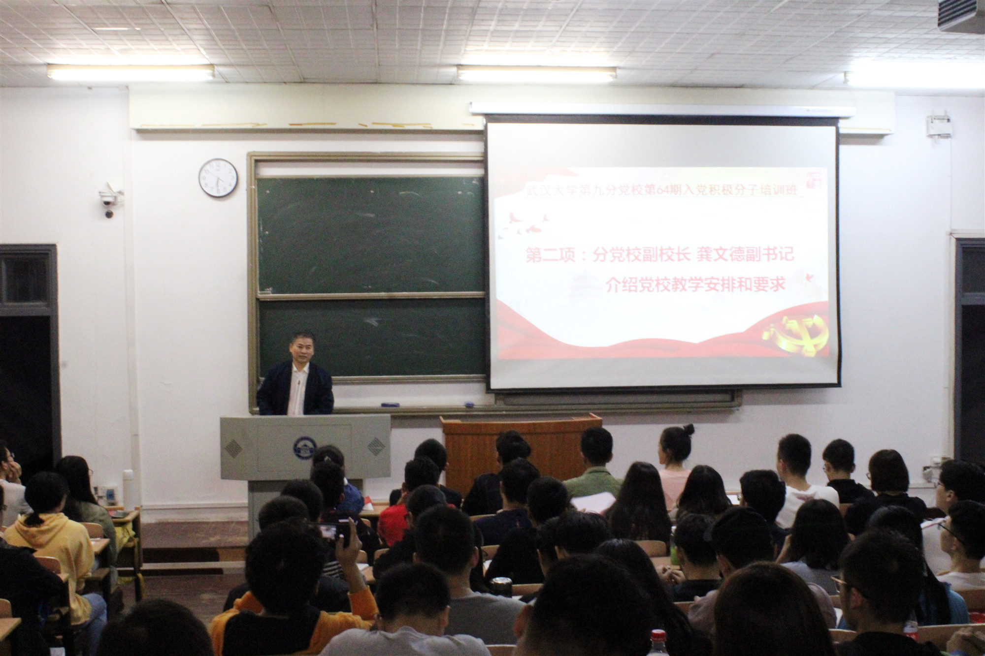 2019年10月13日晚6点30分,武汉大学第九分校第64期入党积极分子培训班开班仪式在工学部五教113教室顺利举行。武汉大学党校督导员李传义老师,第九分党校副校长、院党委副书记龚文德老师,第九分党校副校长、院党委副书记张栋梁老师以及学院全体辅导员出席了本次开班仪式。第64期入党积极分子培训班的全体91名学员参加了开班仪式。本次开班仪式由班主任阿依谢姆·约麦尔老师主持。